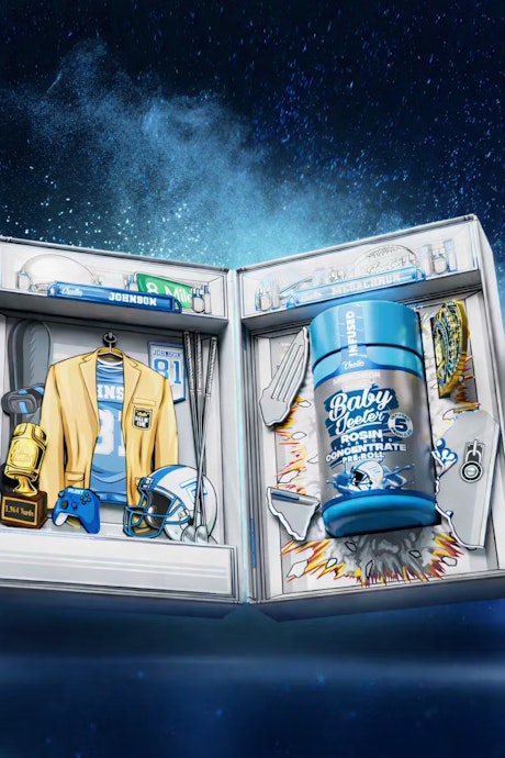 The Highsman x Jeeter "Megachron" is a limited-edition collaboration, featuring 2.5G total of infused pre-rolls (5 x 0.5G Baby Jeeters) packaged in a commemorative locker. These premium indoor flower joints are infused with THCA diamonds, live rosin, and kief, providing high-potency, heavy-hitting effects. Strain/Effects: Megachron often features a indica-dominant or hybrid profile, characterized by deep relaxation, sweet berry flavors, and earthy undertones