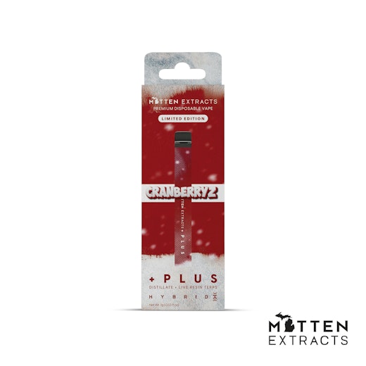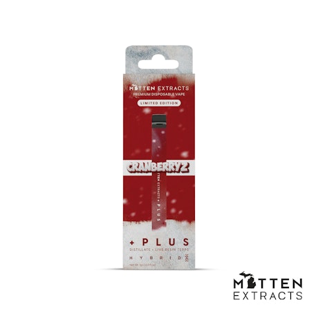 Cranberry Z (Hybrid) 1G – Flavor = tangy + bright + hints of cranberry zest. Long-lasting functioning high. Premium Distillate + Live Resin Terpenes 1-gram rechargeable disposable vapes are perfect for those that are on-the-go and that prioritize convenience. Each flavor is created with Premium distillate + Live Resin terpenes. We hold ourselves to a high standard of quality and a high standard of potency. Mitten + PLUS Disposables empower customers to reach new highs.