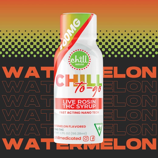 Chill Medicated - To-Go 100mg THC Syrup A 100 mg THC live rosin syrup from Chill Medicated, formulated with a nano‑emulsified, water‑soluble cannabis extract that’s designed for fast onset and flexible dosing. This watermelon variation features a refreshing, tropical sweet and tart profile that pairs well with sodas, juices, or water — or can be taken directly under the tongue for quicker absorption.