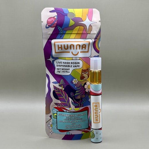Hunna - Strawberry Gelato - .5g Live Rosin Dispo. Vape - 70-119u A .5 gram live rosin disposable vape from Hunna, featuring the sweet and fruity Strawberry Gelato strain in a solventless, all‑in‑one format for convenience and flavor. Live rosin is a solventless cannabis extract made using only heat and pressure to preserve the plant’s natural terpenes and cannabinoids, resulting in clean, rich flavor and smooth vapor without added cutting agents.