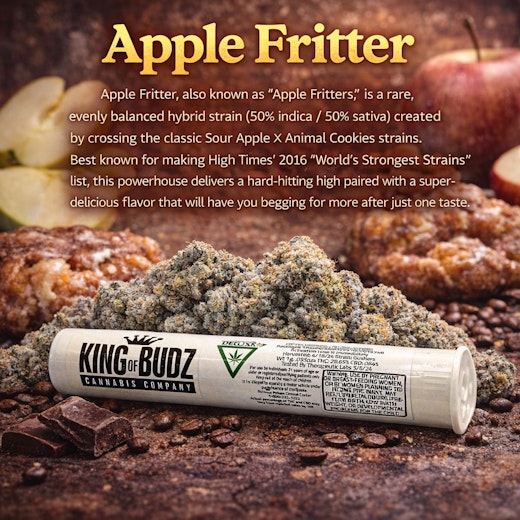 Apple Fritter, also known as “Apple Fritters,” is a rare evenly balanced hybrid strain (50% indica/50% sativa) created through crossing the classic Sour Apple X Animal Cookies strains. Best known for making the High Times' 2016 “World's Strongest Strains” List, this baby brings on a hard-hitting high and super delicious flavor that will have you begging for more after just one taste.