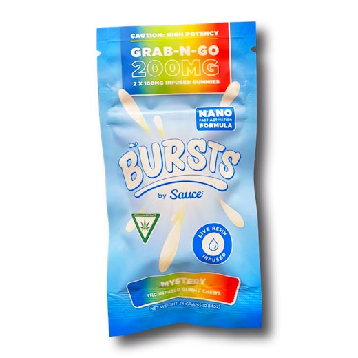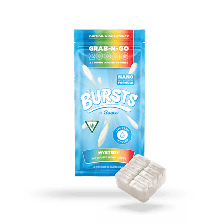 Our gummies are the best in the game! We have perfected the potency, flavor, ingredients, process and activation time. Bursts by Sauce are powered by our 2X Nano Live Resin, which is created using a proprietary process of both encapsulation and sonic energy to break down the molecule size. This makes the gummy hit faster, harder and smoother than any other gummy. Our gummies are also organic, and vegan and gluten free! *Tailor your dosage according to your personal preferences or embark on an intensely elevated adventure by eating the entire gummy. MYSTERY FLAVOR: Embark on a tantalizing adventure with our Mystery High Potency edible, a flavor full of nostalgia. Launch into a captivating blend of cherry, lime and blue raspberry that will bring you back to summers full of rocket pops and pool days. Let the mystery unfold and allow yourself to be pleasantly surprised by the alluring allure of our white Mystery edible. Enjoy consistent calming relief within minutes, with the fastest activation on the market using our 2X Nano Indica Live Resin.