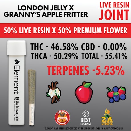 50% Element Live Resin, 50% top-shelf flower, the Element Live Resin Joint is certified 100% fire. This award-winning infused pre-roll adds the power of Element Live Resin to premium flower, resulting in a naturally terpene rich joint with THC percentages commonly 45% or above.