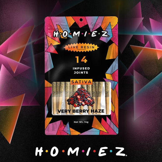 Homiez - 14pk (1g) Infused Pre-Rolls - Very Berry Haze (Sativa) Step up your session with Homiez’s elite 14-pack of 1 g prerolls, each infused with premium live resin for maximum flavor and impact. Crafted for smooth, consistent burns and rich terpene profiles — ideal for sharing with your crew or keeping stocked for serious sessions.