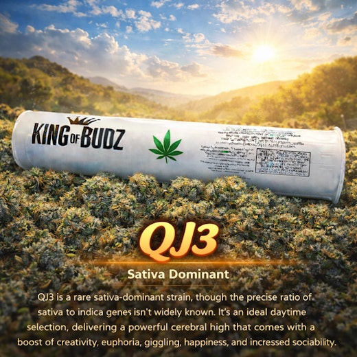 QJ3 is a rare sativa-dominant strain, though the precise ratio of sativa to indica genes isn't widely known. It's an ideal daytime selection, delivering a powerful cerebral high that comes with a boost of creativity, euphoria, giggling, happiness, and increased sociability.