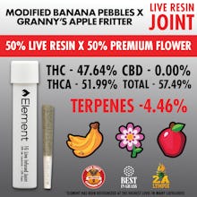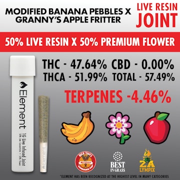 50% Element Live Resin, 50% top-shelf flower, the Element Live Resin Joint is certified 100% fire. This award-winning infused pre-roll adds the power of Element Live Resin to premium flower, resulting in a naturally terpene rich joint with THC percentages commonly 45% or above.