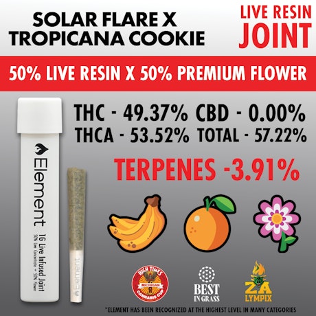 50% Element Live Resin, 50% top-shelf flower, the Element Live Resin Joint is certified 100% fire. This award-winning infused pre-roll adds the power of Element Live Resin to premium flower, resulting in a naturally terpene rich joint with THC percentages commonly 45% or above.