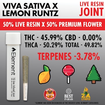 50% Element Live Resin, 50% top-shelf flower, the Element Live Resin Joint is certified 100% fire. This award-winning infused pre-roll adds the power of Element Live Resin to premium flower, resulting in a naturally terpene rich joint with THC percentages commonly 45% or above.