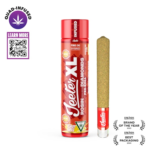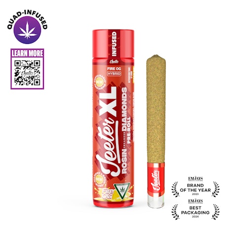 Fire OG Jeeter XL Infused Rolled Joint: 2g Joint | Hybrid | 40.77% Quad-Infused | Premium Flower Infused with Liquid Diamonds, Rosin Blend & Kief Fire OG is an Indica-dominant hybrid strain that is a cross between OG Kush and SFV OG Kush. At the core of Jeeter is our Culture .. a culture of love, passion and innovation. We value relationships and the culture of our company can been seen in everything we do from our products, to our brands, to our facilities, to our love for our customers and each other.