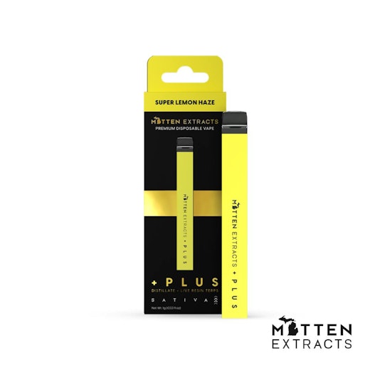 Super Lemon Haze (Sativa) - Flavor = zesty lemon + earthy + tart candy. Long-lasting functioning high. Premium Distillate + Live Resin Terpenes 1-gram rechargeable disposable vapes are perfect for those that are on-the-go and that prioritize convenience. Each flavor is created with Premium distillate + Live Resin terpenes. We hold ourselves to a high standard of quality and a high standard of potency. Mitten + PLUS Disposables empower customers to reach new highs.
