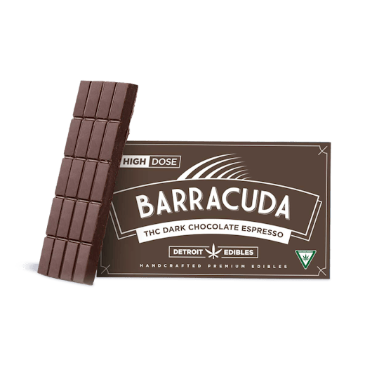 The NEW Dark Chocolate Espresso Barracuda Bar from Detroit Edibles is a decadent addition to our line up of THC infused chocolate. Smooth dark chocolate produced from 65% Belgian Chocolate, combined with rich espresso flavors, and the purest distillate from our very own Michigan-made Cannalicious Labs, our espresso dark bar is sure to be your new preferred mocha coffee treat.