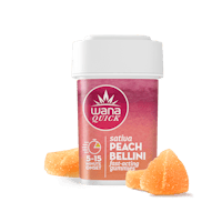 Peach Bellini | Sativa | Scored Gummies Per Package: 200mg THC Per Piece: 20mg THC These fast-acting peach gummies will add some zip to your day with their inspiring blend of 30+ uplifting terpenes. Like all Wana edibles, they're vegan, melt-proof, made with organic sweeteners, and enhanced with 30+ terpenes.