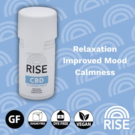 Established out of a desire to improve patient well-being, RISE products provide a robust custom cannabis platform. Each tablet contains 50mg total cannabinoids and natural terpenes. RISE products are also free of sugar, gluten, and nuts. 50mg CBD Tablets are non-psychoactive and promote improved mood, lessened anxiety, and relaxation. CBD Tablets - 50mg per tablet. 30 tablets/bottle
