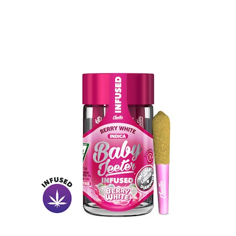 Baby Jeeter Infused - Five .5g Joints 2.5g | Indica | Infused with THCa Diamonds & Rosin Jeeter’s Quad Infused Prerolls combine four layers working in sync for a maxed out infused experience. THCA diamonds add potency, rosin brings smooth, full spectrum depth, expertly crafted terpene profiles help shape the entourage effect while enhancing aroma, and a kief finish adds strength with a hand crafted touch. The result is a harder hitting experience with richer flavor that lasts longer.