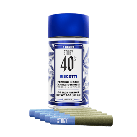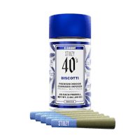 Elevate your pre-roll game. Stiiizy 40s pre-rolls are setting the standard with high potency, cannabis infused joints coated evenly with kief. Using our proprietary live resin infusion methods, we’ve designed every pre-roll to offer 40%+ THC potency with a unique flavor profile. With a smooth inhale and tasteful exhale, each and every Stiiizy 40 is packed with indoor grown flower, specifically made to ensure a potent and long-lasting high. Spark up the 40s. BISCOTTI TASTE: Earthy, Pine, Nutty FEELING: Relaxing, Sleepy, Giggly DESCRIPTION: An Indica-dominant strain that comes from Gelato #25 and South Florida OG. Biscotti delivers a powerful body high and delicious flavor.