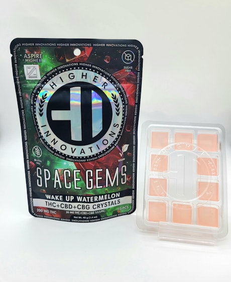 Space Gems are sugar free, isolate infused, lozenge gems. A product that started in the legacy market to bring much needed relief to patients that can't consume large amounts of sugar and are looking for an alternative to the normal products offered in the market. When sublingually ingested the users will see a shortened activation time. In the Space Gems line up Higher Innovations currently have 5 flavors available with a wide range of effects. Wake Up Watermelon is a daytime lozenge that provides users with an even dosing 1:1:1 of THC, CBD and CBG. Each piece contains 20mgs of each cannabinoid and THC. In combination these cannabinoids play o each other and enhance the eects of one another. Evenly split lozenge in half for a 10mg dose of each.