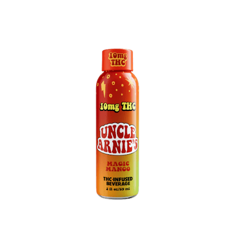 On the go? Grab an Uncle Arnie's 200mg THC Magic Mango Shot! Get ready for a little twist with our Magic Mango shot. Remember those mango gummy rings? Uncle Arnie took the flavor, and created a cool, fruity blast with a surprise peachy finish that makes every sip a bit of an adventure. But unlike gummies, Arnies nano-molecular tech will have you feeling magic in 20-40 minutes.