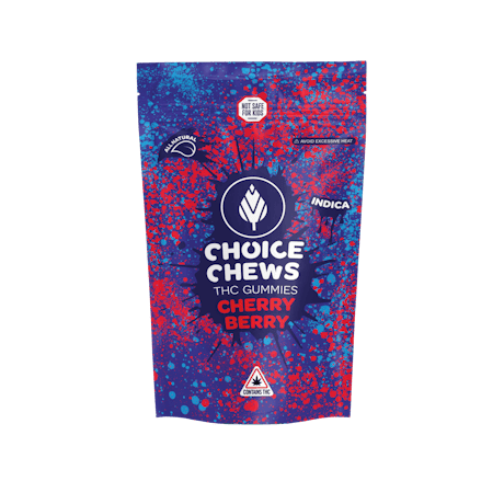 Indulge in the rich, calming taste of Choice Chews' Cherry Berry gummies. Infused with an indica blend, these gummies offer a luscious mix of cherry and berry flavors, bringing a soothing, yet invigorating experience that makes relaxation effortless.