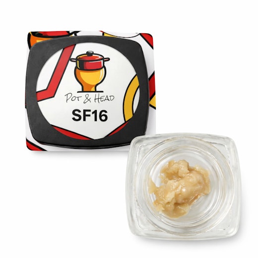Pot & Head SF16 Cold Cure Live Rosin is a premium solventless concentrate crafted using a cold-cure process to enhance terpene expression and create a smooth, creamy texture. Extracted with heat and pressure from fresh cannabis, it preserves natural cannabinoids and rich flavor. This 1-gram rosin delivers bold, terpene-rich dabs with strong, balanced effects and a clean, full-spectrum experience.