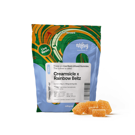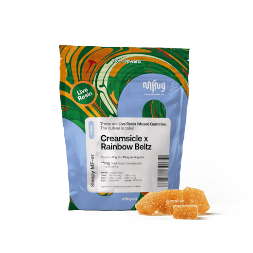 MFNY – Creamsicle x Rainbow Beltz 2.0 – Live Resin Gummies (Indica) – 10pk – 100mg Sativa-Enhanced Edibles | Live Resin Infused | Bold Flavor Duo | 10 Gummies – 100mg THC Total Bright, bold, and bursting with energy—MFNY’s Creamsicle x Rainbow Beltz 2.0 Live Resin Gummies deliver a dynamic sativa experience with a flavor punch to match. This 10-pack of premium cannabis gummies offers a balanced 10mg dose of THC per piece, perfect for elevating your day with clarity and focus.